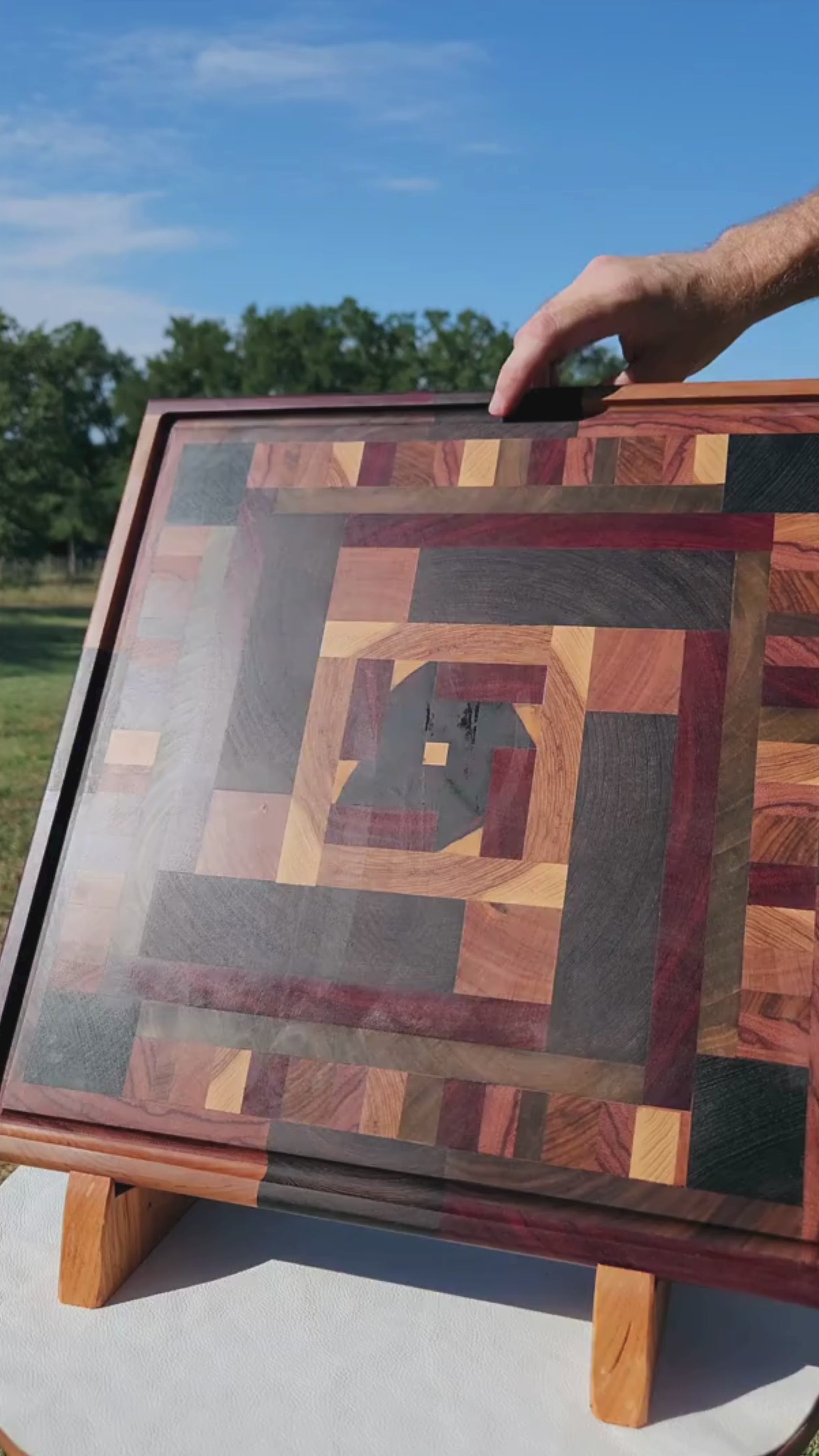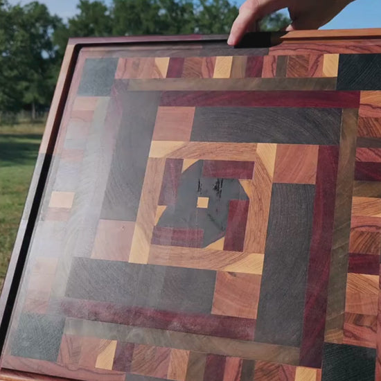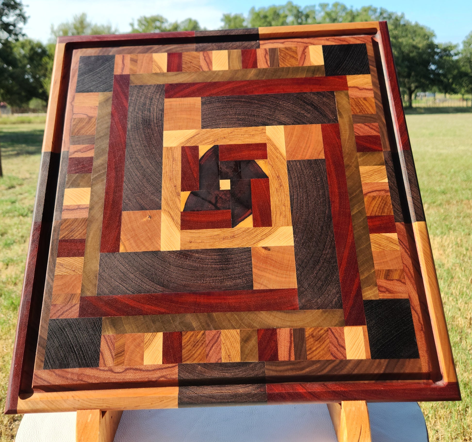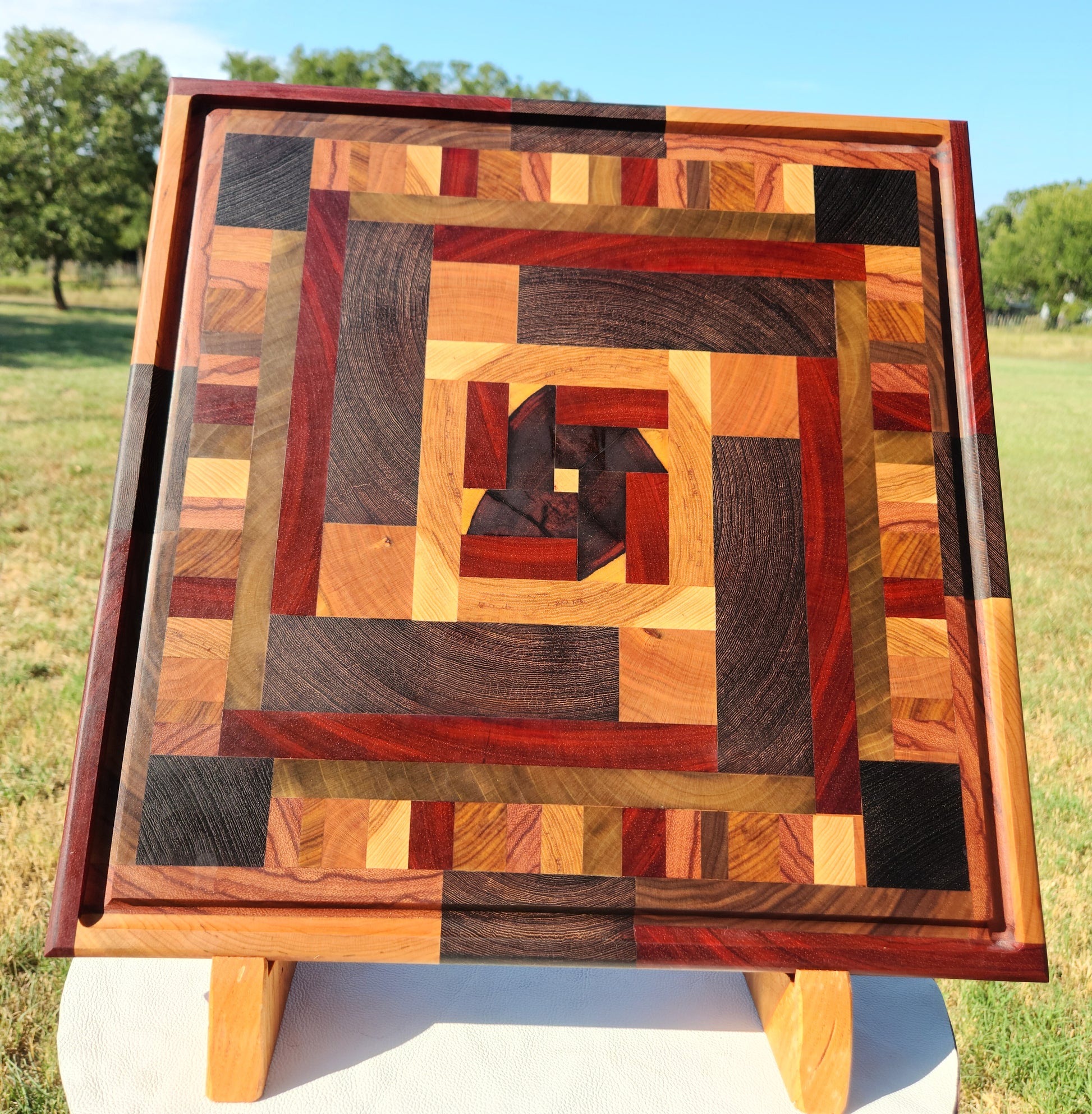 This one of a kind cutting board with a juice groove and non-slip feet handmade in Cool, Texas features a rich blend of Wenge, Padauk, Zebrawood, Pecan, Mexican Ebony, and other hardwoods. Each wood type chosen for its durability and striking grain.