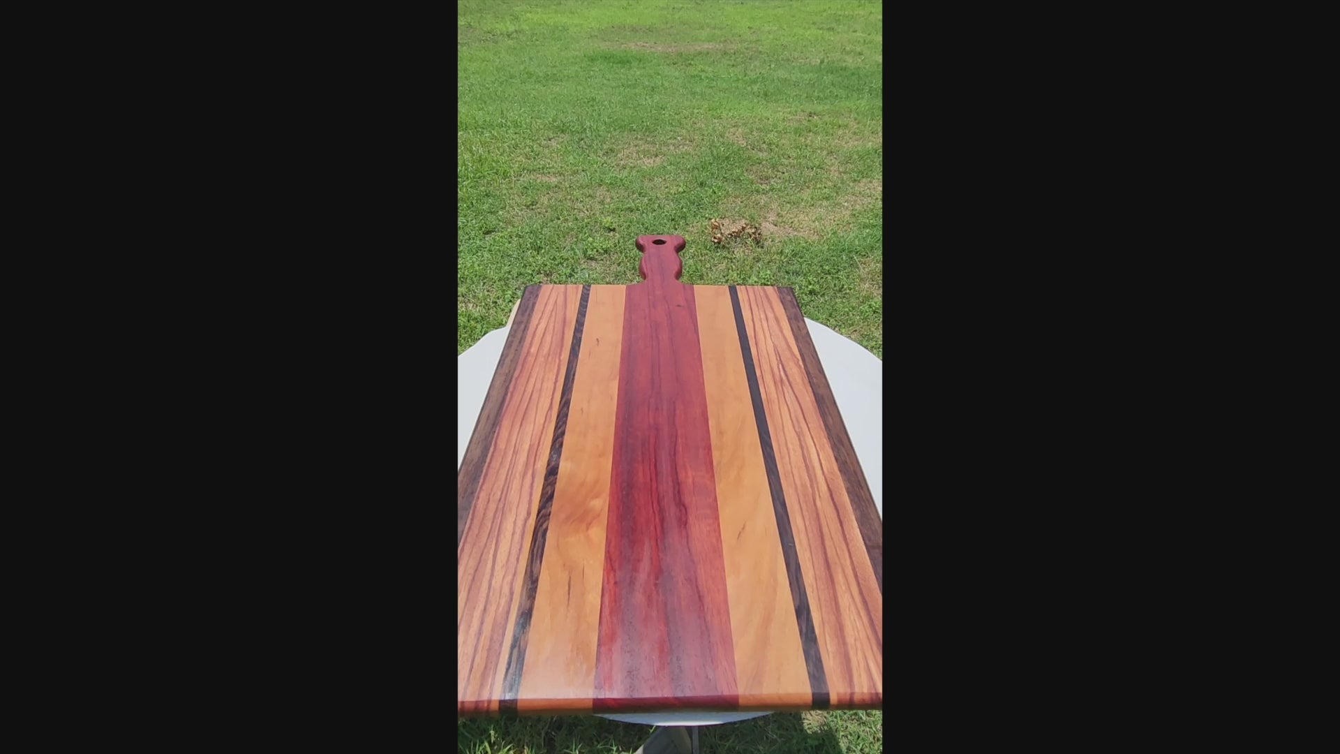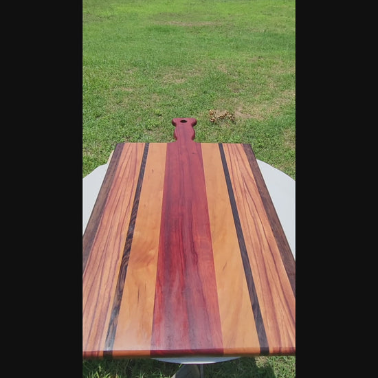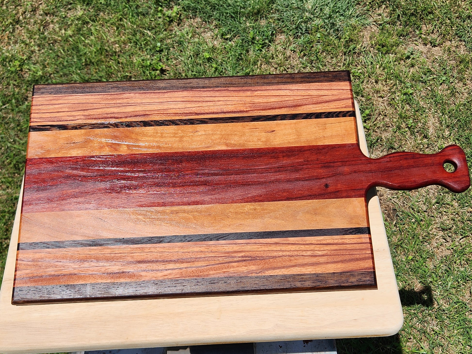 One of a kind charcuterie board handmade in Cool, Texas. Made from Padouk, Wenge, Red Zebra wood and quilted Cherry with a contoured handle.This did not come from China or a factory. No stains were used, these colors are natural. it is sealed with beeswax and food grade mineral oil.