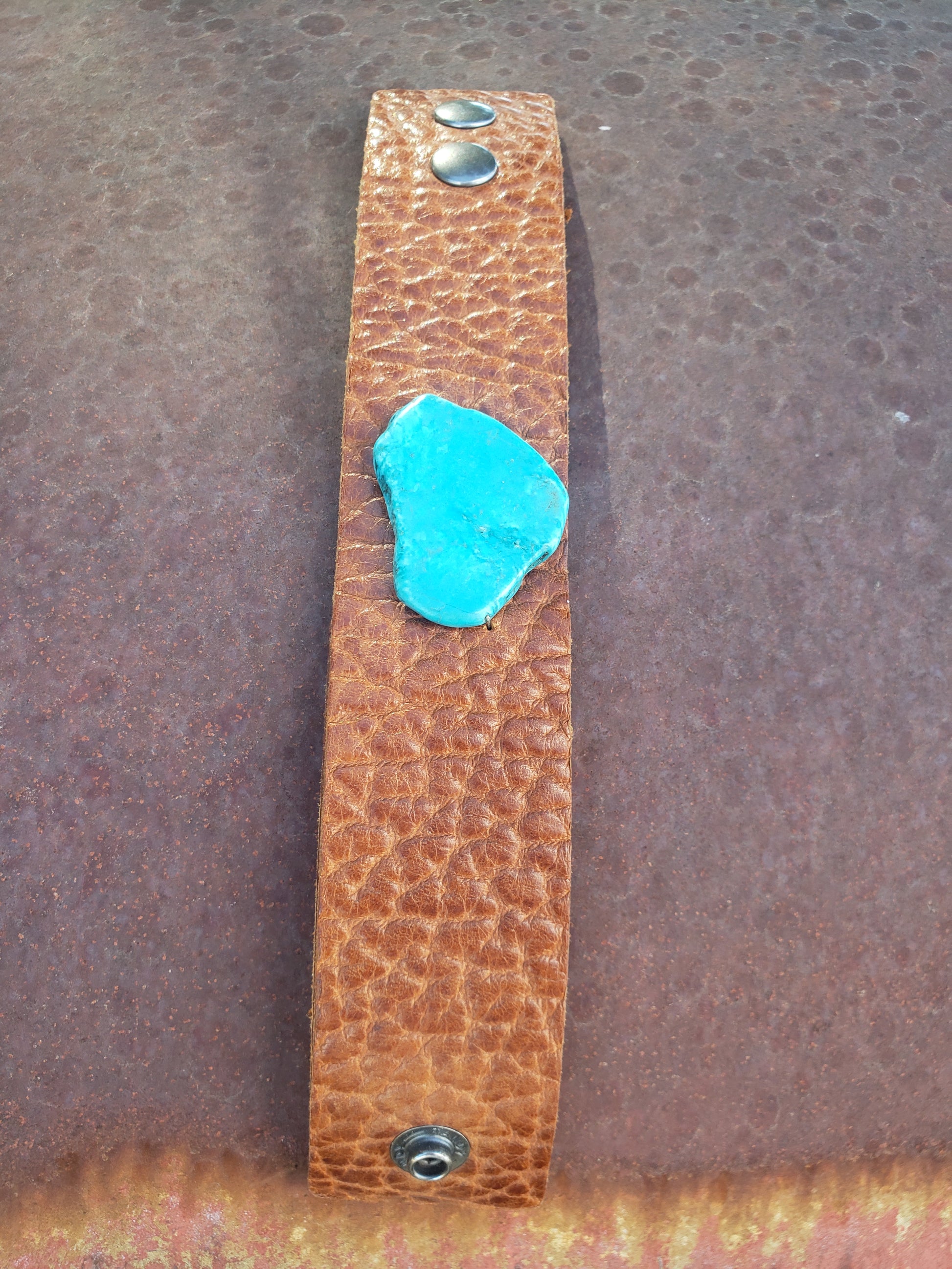 Hand made from leather decorated with a piece turquoise. Fits 7.25 inch or smaller.
